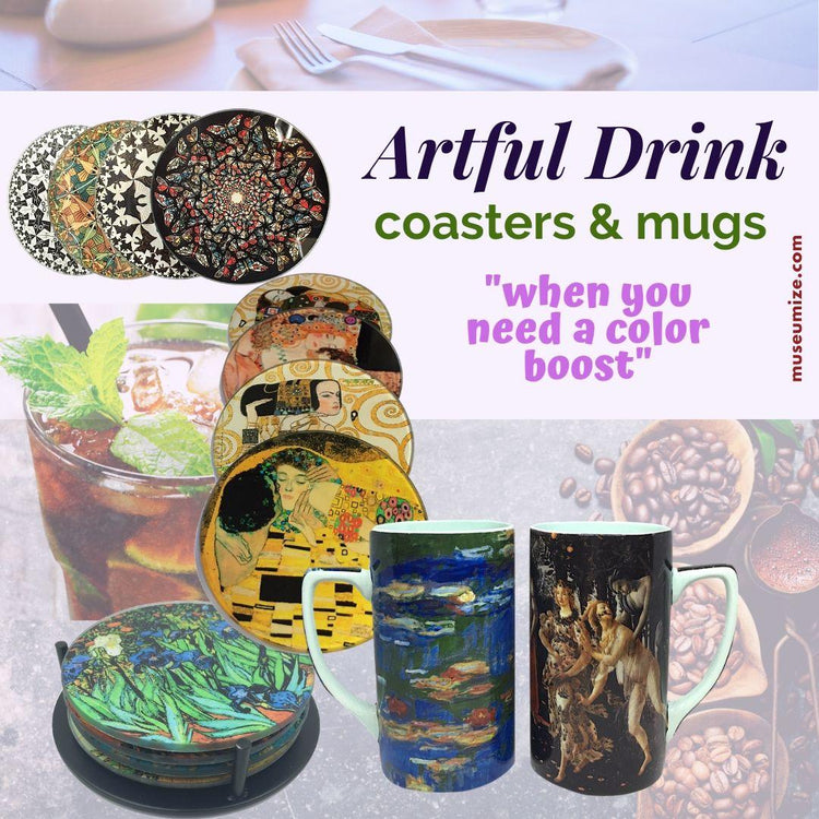 Decorate your table with museum drink coasters and painterly coffee mugs inspired by famous artworks. Each glass coaster set features four masterpieces, printed in vivid color and protected beneath smooth glass.