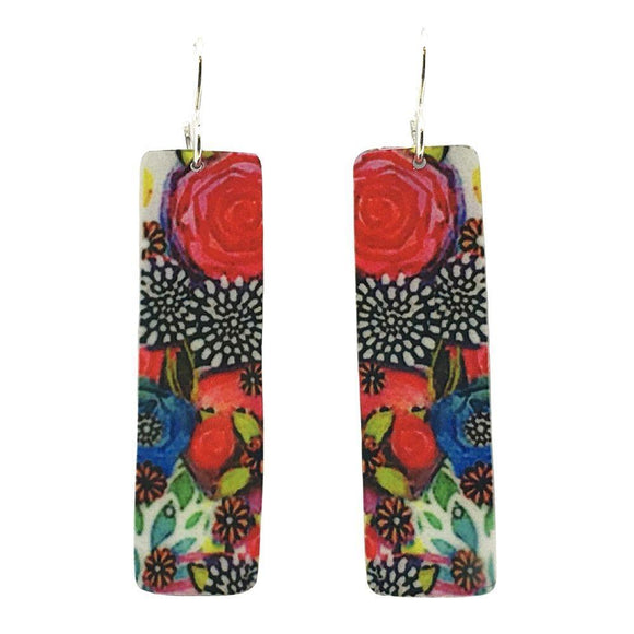 Wildflowers Tapered Oval Orange Red Green Handmade Aluminum Artisan Earrings 1.75L