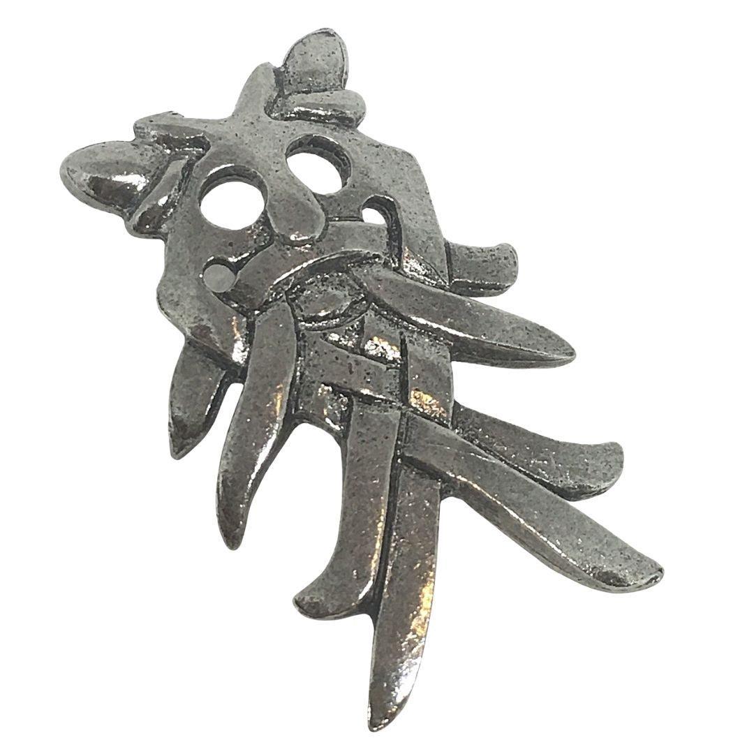 Pewter Odin's Mask supplied on a pin with clasp. In this stylized portrait, Odin's hollow eyes look out at us as his beard is woven with sword blade looking hairs. The overall look is foreboding, mercilous, and strong.