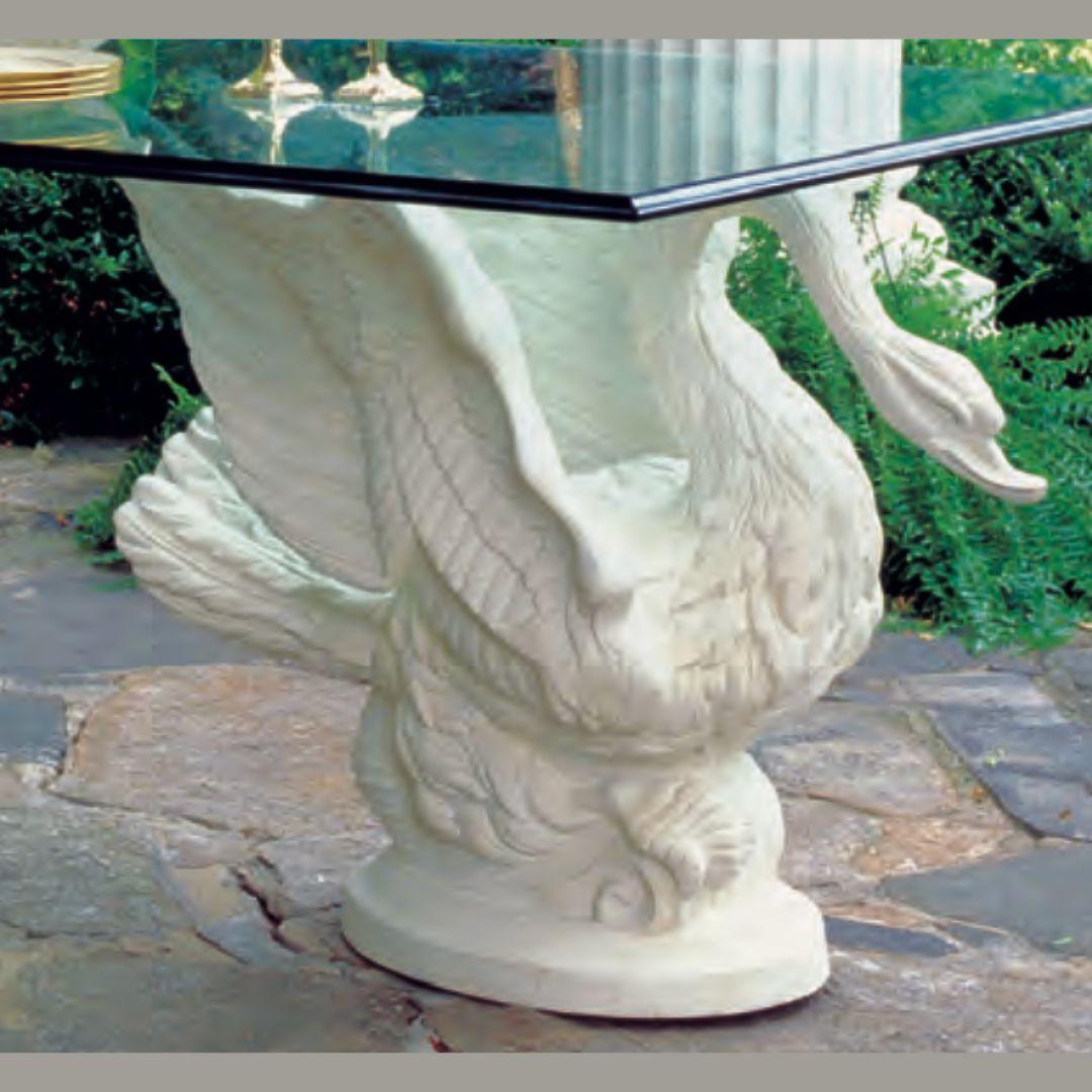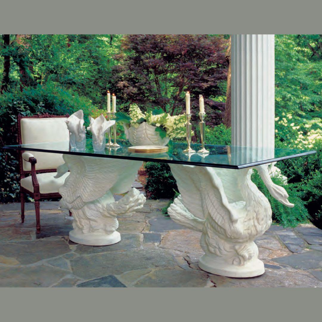 This Swan Dining Table Base is full of dynamism. The swan bird appears to be landing or taking off with wings assuredly back, tail up, and neck curved decidedly forward. This is a fine quality table base, hand cast in the USA from a strong fiberglass material. It has extraordinary detail on all sides. Pictured in a pristine white finish.