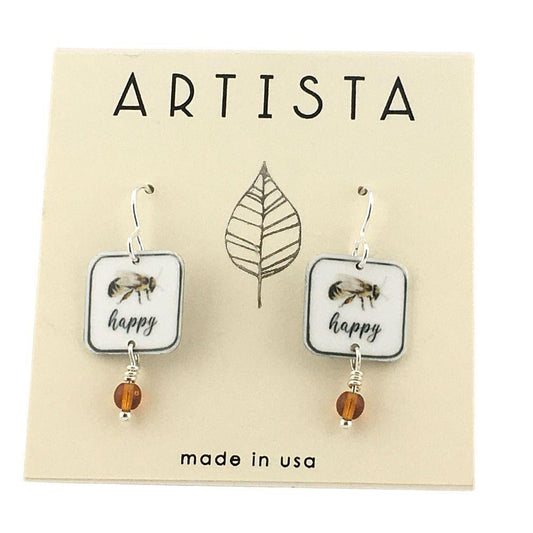 Bee Happy Small Square with Beads Handmade Artisan Earrings 1.25L