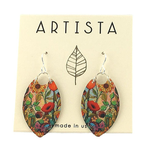 Wildflowers Tapered Oval Orange Red Green Handmade Aluminum Artisan Earrings 1.75L