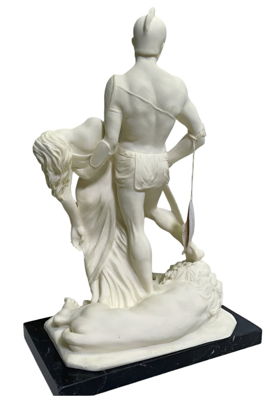 Statue – Warrior Holding Woman with Lion 16 in H Santini Bonded Marble Italy Attic No Returns