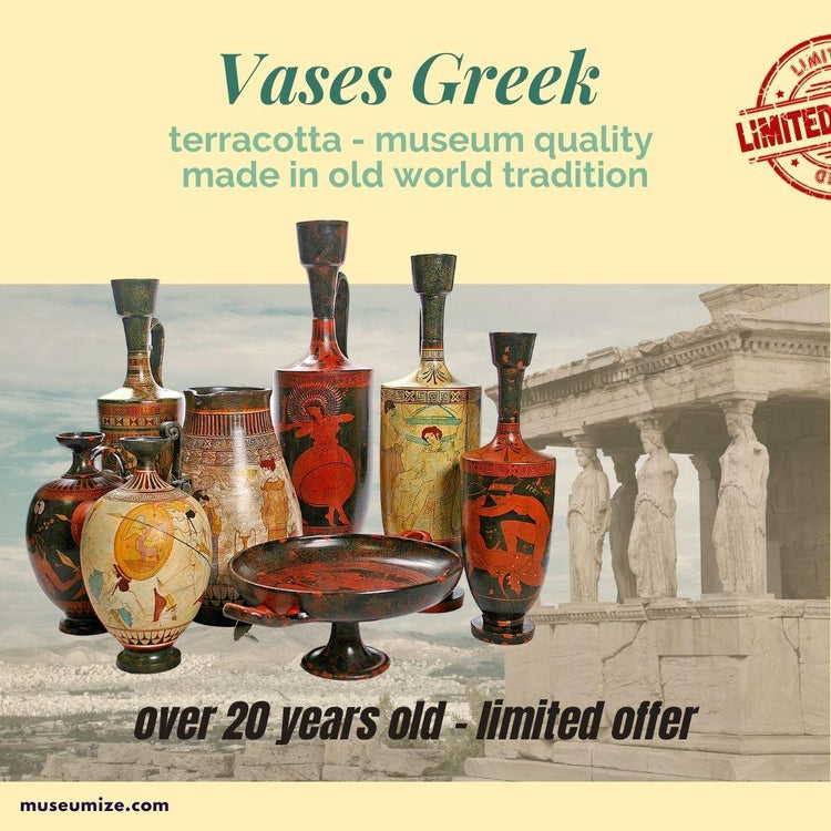 The Greek Vase was a functional object common in ancient daily life. It was used for drinking, eating, cooking and transporting foods and liquids. The shapes give us insight into its primary use and the designs on the outside illustrate religious scenes of their ancient pagan gods or famous historical events. We often find images of Athena The Warrior, Hercules the Hero, Dionysos in the Bacchanal, and famous stories from the Trojan War. They were also used in very early times as a funerary urn buried in the ground with the ashes of the deceased. In Greece today, the tradition of Greek vase making continues as artists create terracotta vases in the age old tradition and paint scenes from ancient Greek pattern books. We hope you enjoy celebrating ancient Greek and Roman history by looking at these classical vase reproductions.