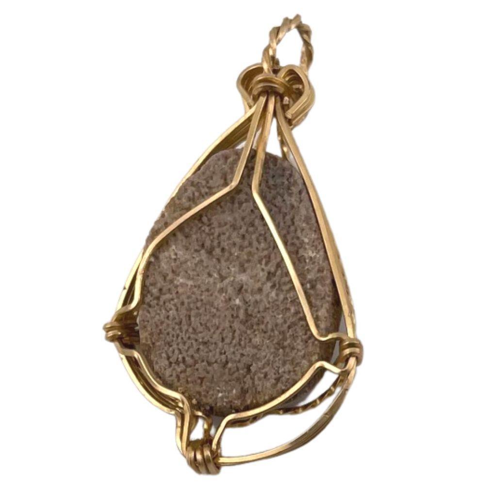 This pendant stone is inserted into a hand-wrapped wire metal bezel. The metal is either gold plated or plated silver. The item is handmade and one of a kind. It will make a wonderful starting point for a beaded necklace of your making.