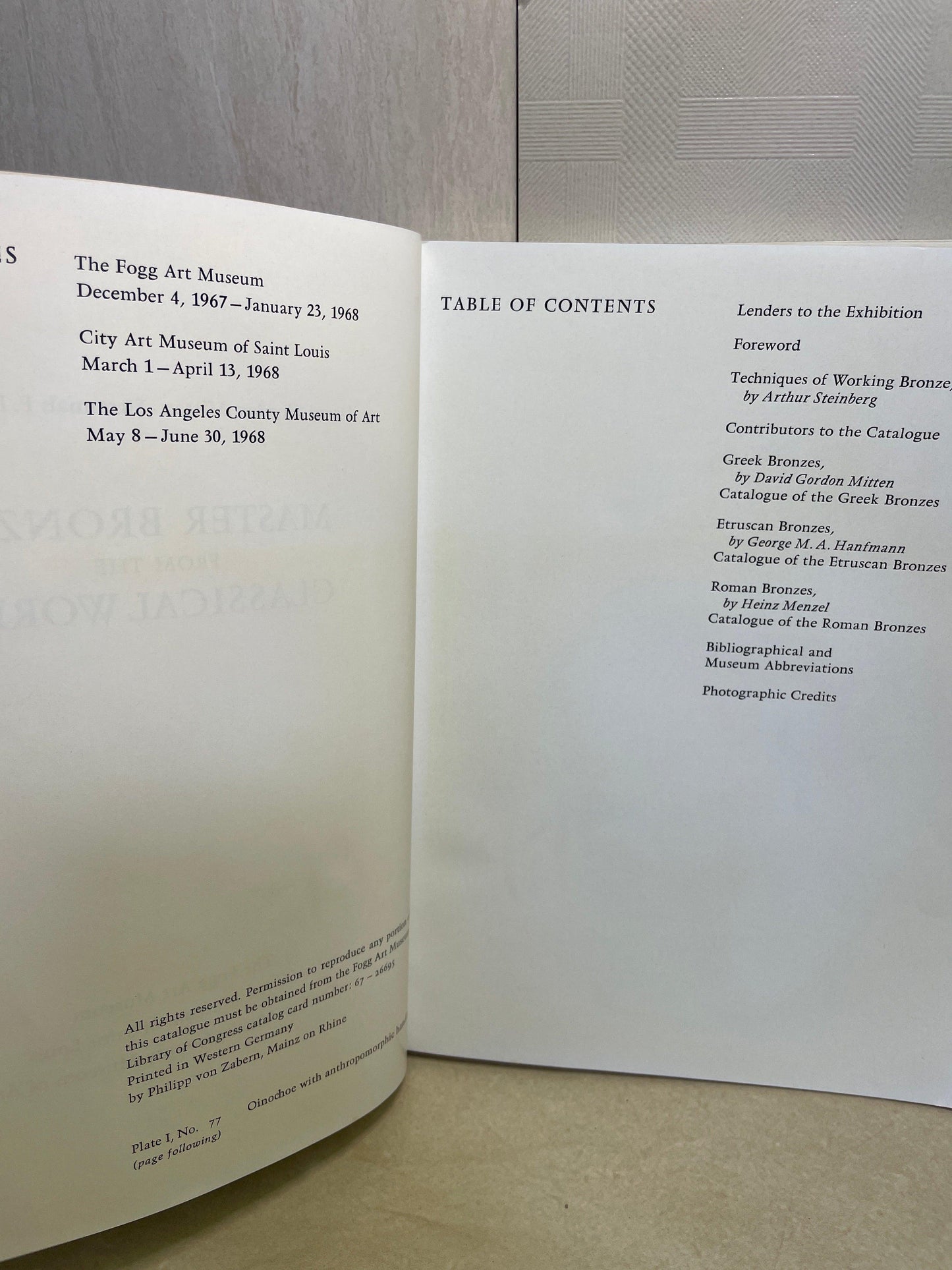 This book "Master Bronzes from the Classical World" is a museum catalog for a 1968 traveling exhibition held at The Fogg Art Museum, the City Art Museum of Saint Louis, and the Los Angeles County Museum of Art. The authors are David Gordon Mitten and Suzannah F Doeringer.