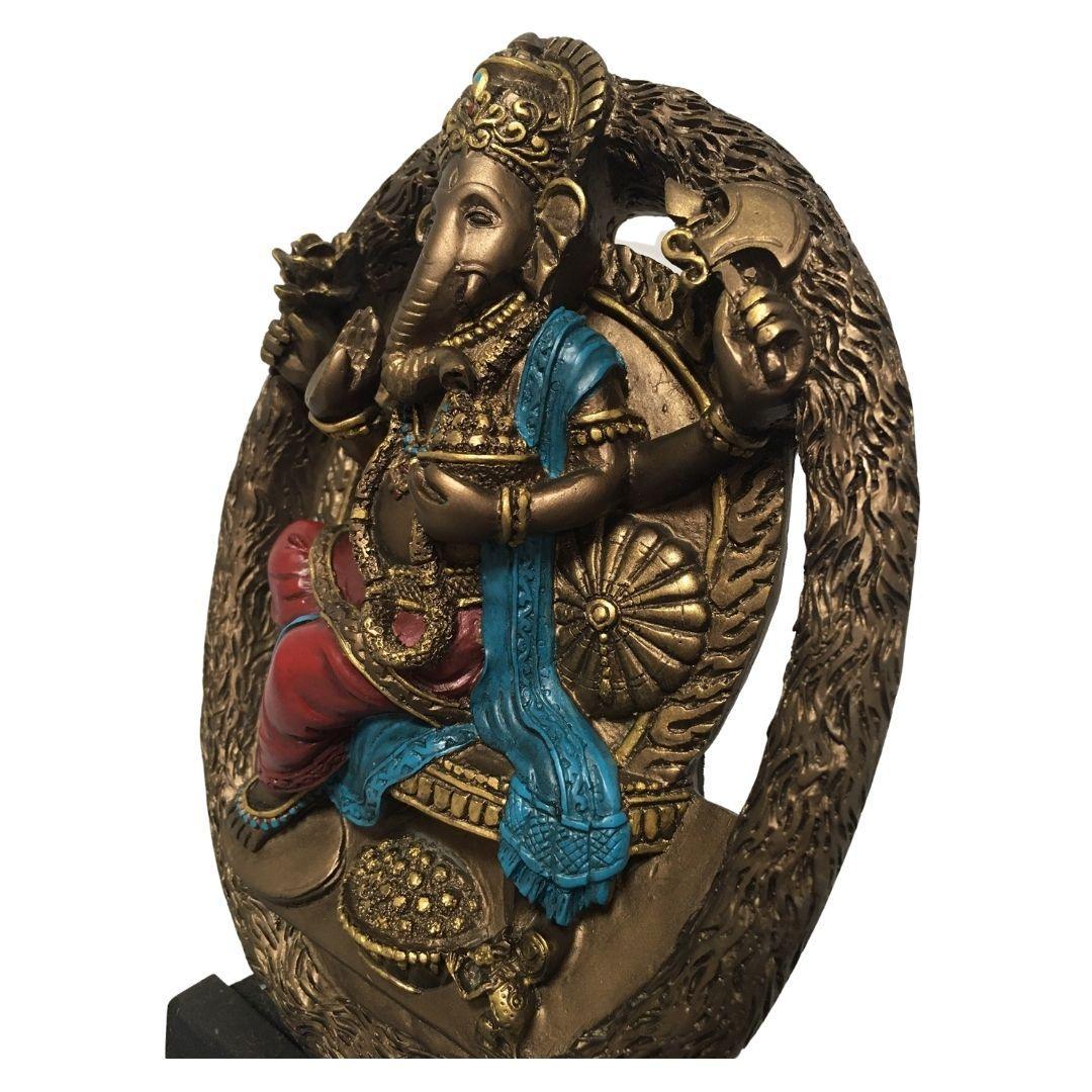 - Made from resin and stone with an antiqued bronze finish and color details. The coloring adds an elegant flair to this Hindu wall hanging. Ready to hang with a mounting bracket in the back or position on the display base pictured which comes with the artwork.