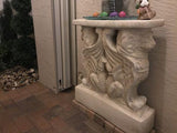 Made from reinforced plaster and measures 29 in H, 8 in W x 25 in L at top, 8 in W x 27 in L at base.