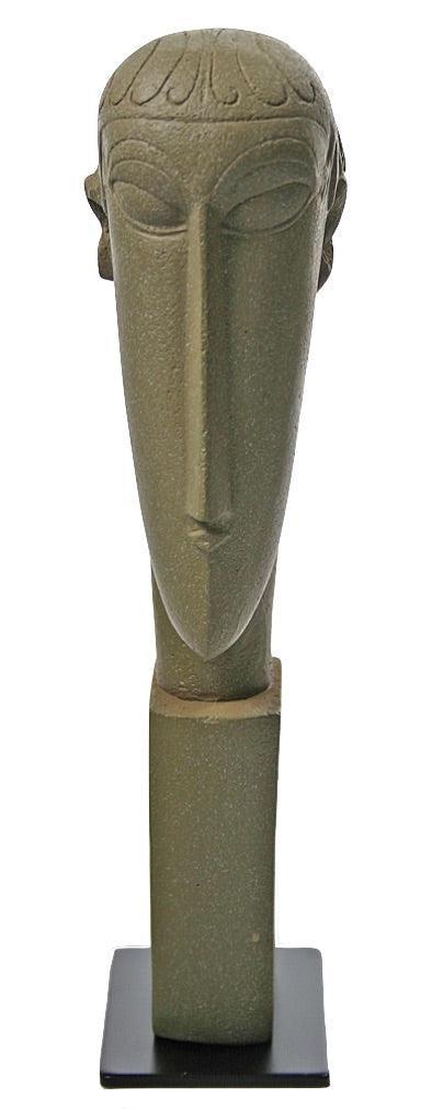This statue reproduces a Modigliani original which is a study of a female head here interpreted in an elongated shape. The head has been reduced to its geometric origins which is rounded and simplified. It is part of a series of female stone heads sculpted by modern art Amadeo Modigliani in the early 20th century.