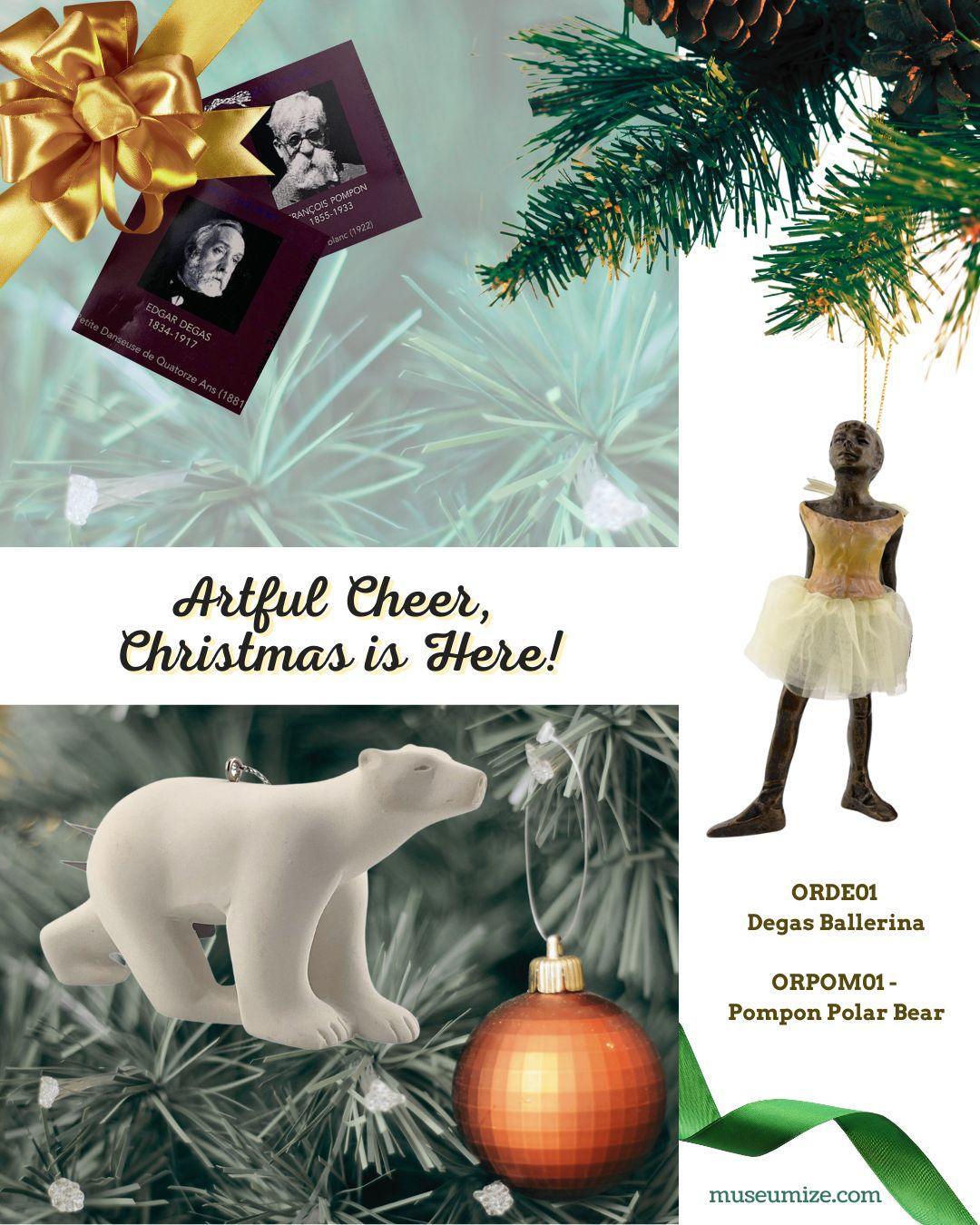 Christmas ornament miniature sized statue of Degas Little Dancer Ballerina of Fourteen Years Old. She is a beloved image of a young girl in a ballet pose. As a tree ornament, she hangs gracefully from a golden cord. (PN ORDE01).