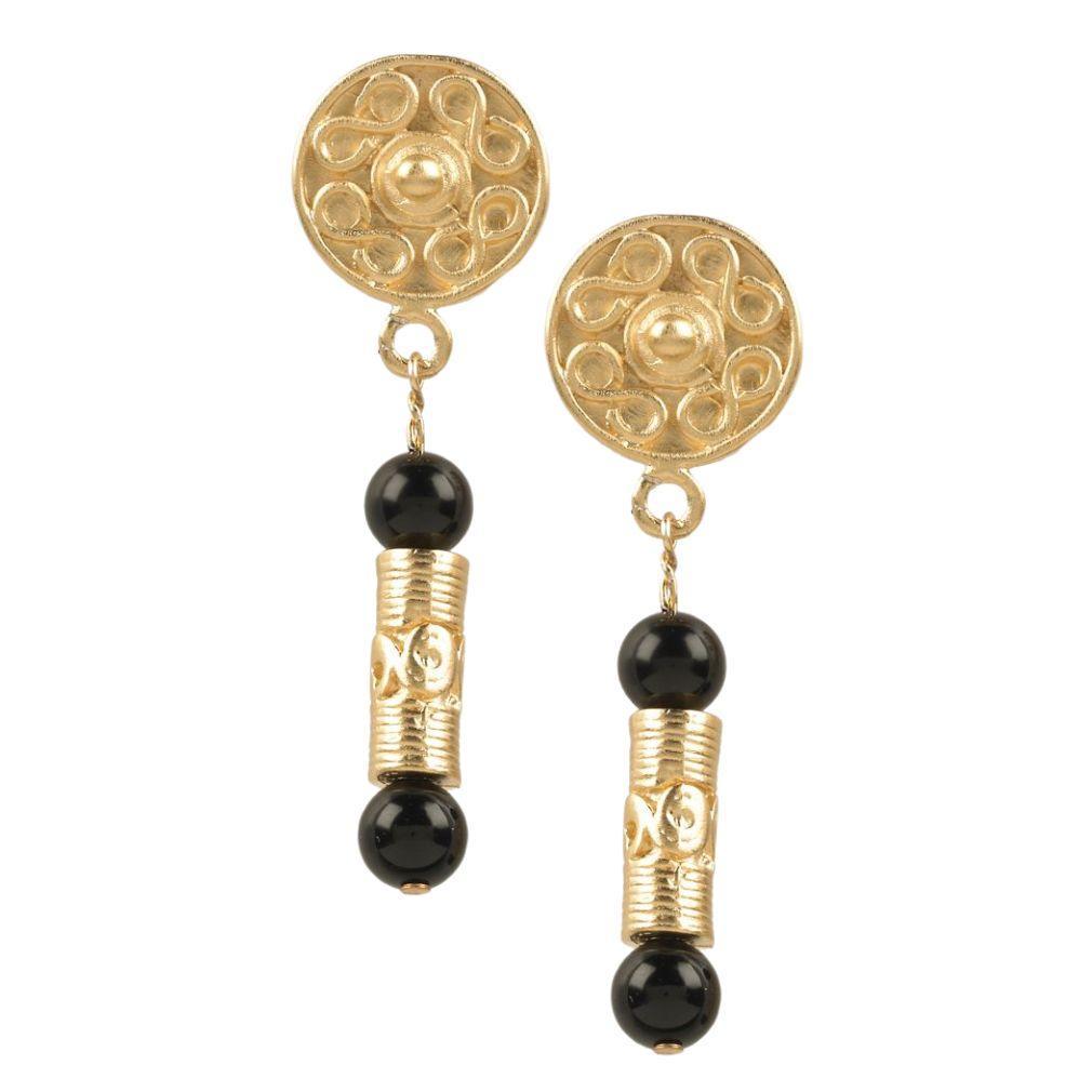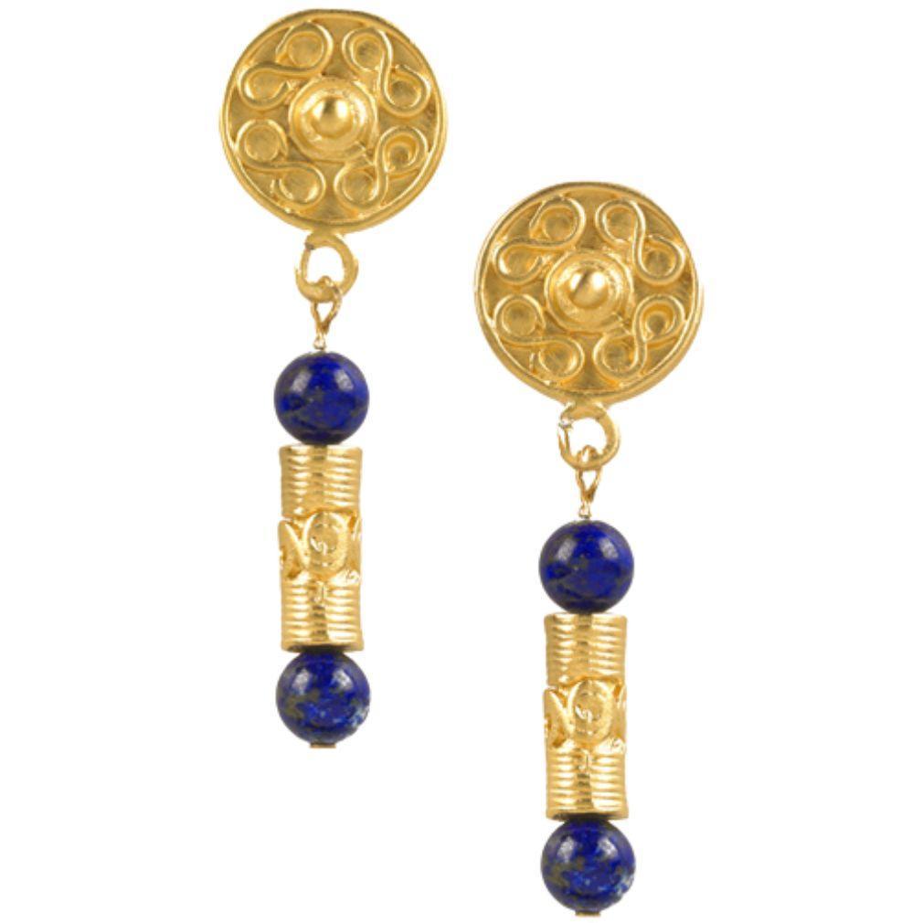 Each pair is decorated with your choice of beads—black onyx, red carnelian, or blue lapis—adding vibrant color and cultural depth to the design. Whether worn for their historical significance or as a bold statement piece, these earrings bring ancient artistry into the contemporary world with style and meaning.