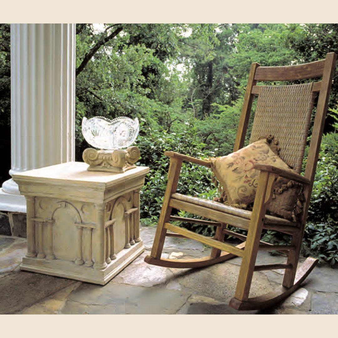 Classical arches and columns decorate all four sides of this square side table base. The arches and columns remind one of Renaissance and Baroque architects who were fascinated with classical architecture of ancient Greece and Rome. The facade evokes sketches by Bramante or Brunelleschi. Created by Southern artist R. Shipman, it adds a stately nod to the great architects of western architecture. (PN HP600)