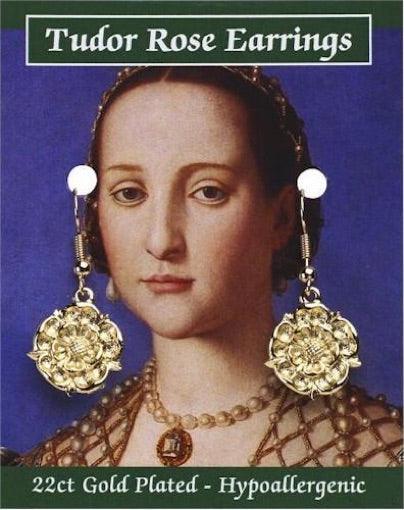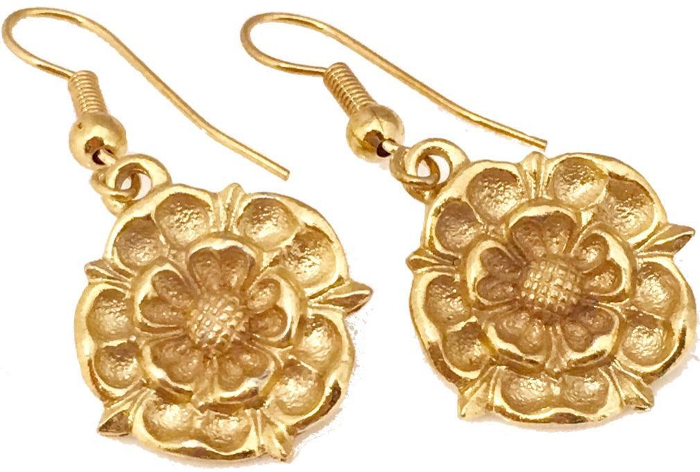 This pair of women's earrings has the Tudor rose as a graceful dangle. It is reproduced after jewelry in the collection of English royalty. Wear these with your Renaissance costume for extra historical authenticity.